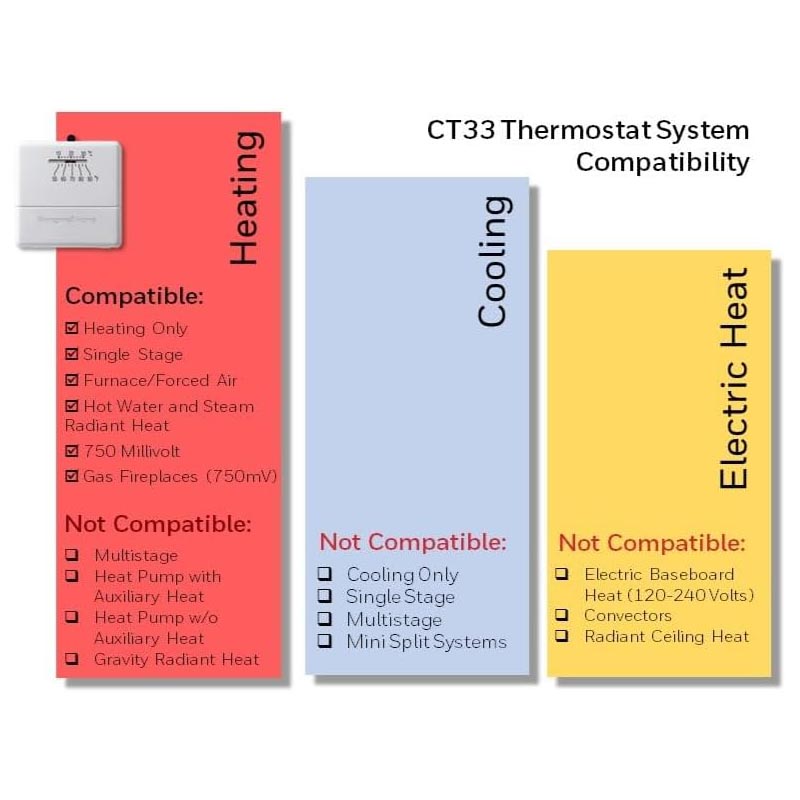 - NOT compatible with electric baseboard heat (120-240 V), heat pumps or multi-stage heating/cooling.