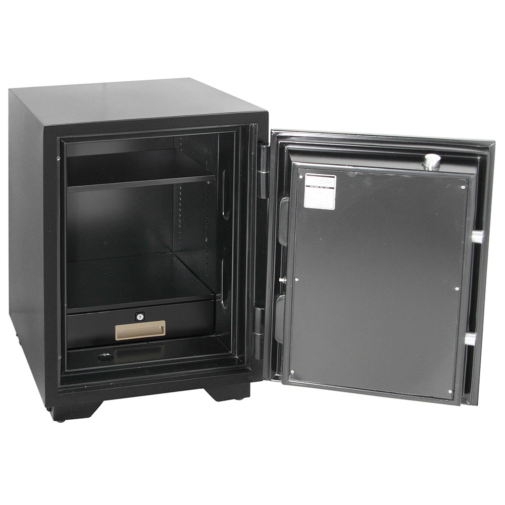 The Honeywell 2116 Fire Safe features a storage capacity of 2.35 cubic feet. Secure unprecedented levels in peace of mind with this chest's ability to withstand a fire of up to 1700° F for one hour. A water resistant door has also been implemented to combat leaks, spills and various other forms of water damage. Coated in steel, this safe utilizes a programmable digital keypad that effectively allows users to program their own personal three to eight digital pass code. An LED control panel has also been fully realized to display the date and time. Intuitive technology has allowed two separate individuals to access the safe with their own unique pass codes. For additional security levels, the primary user can retrieve a 'user's access' history. An easy to hear alarm has also been implemented and will sound off when the safe is tilted or moved. In the event of battery failure, access to an override key has been installed to effectively bypass the digital pass code.