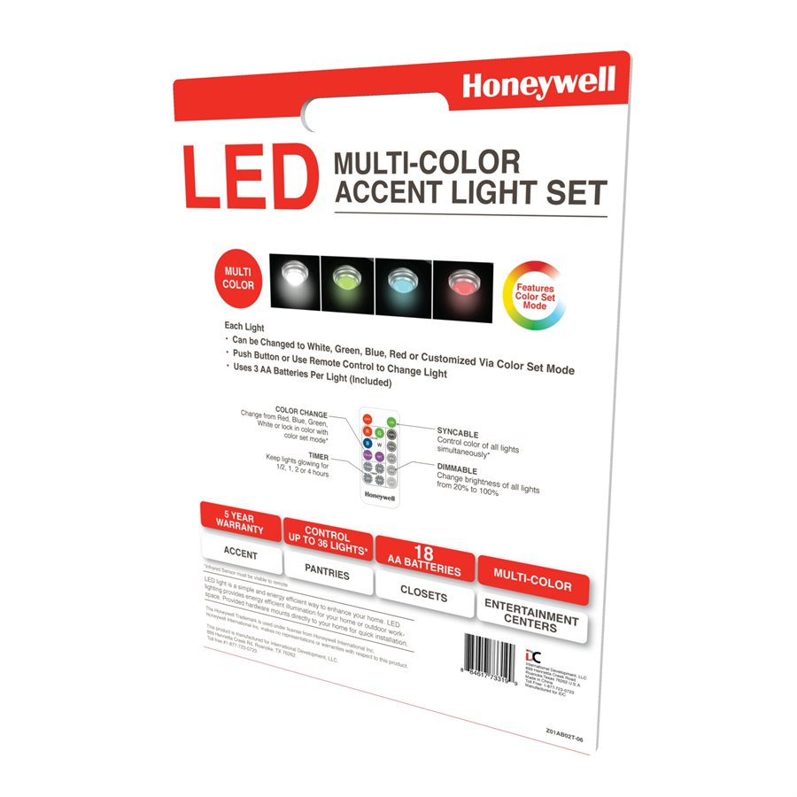 The Honeywell Battery Powered Accent LED Multi-Color Light Set enhances darker areas including shelves, pantries, entertainment centers and many other areas where accent lighting is required. The remote control allows you to cycle through red, white, green or blue colors. Owners can also select custom colors using the "color set" feature. Owners can even set a timer to automatically turn off or dim the lights from 100% to 20% light intensity. Honeywell Battery Powered Accent Light Set features a white finish with frosted plastic lens.
