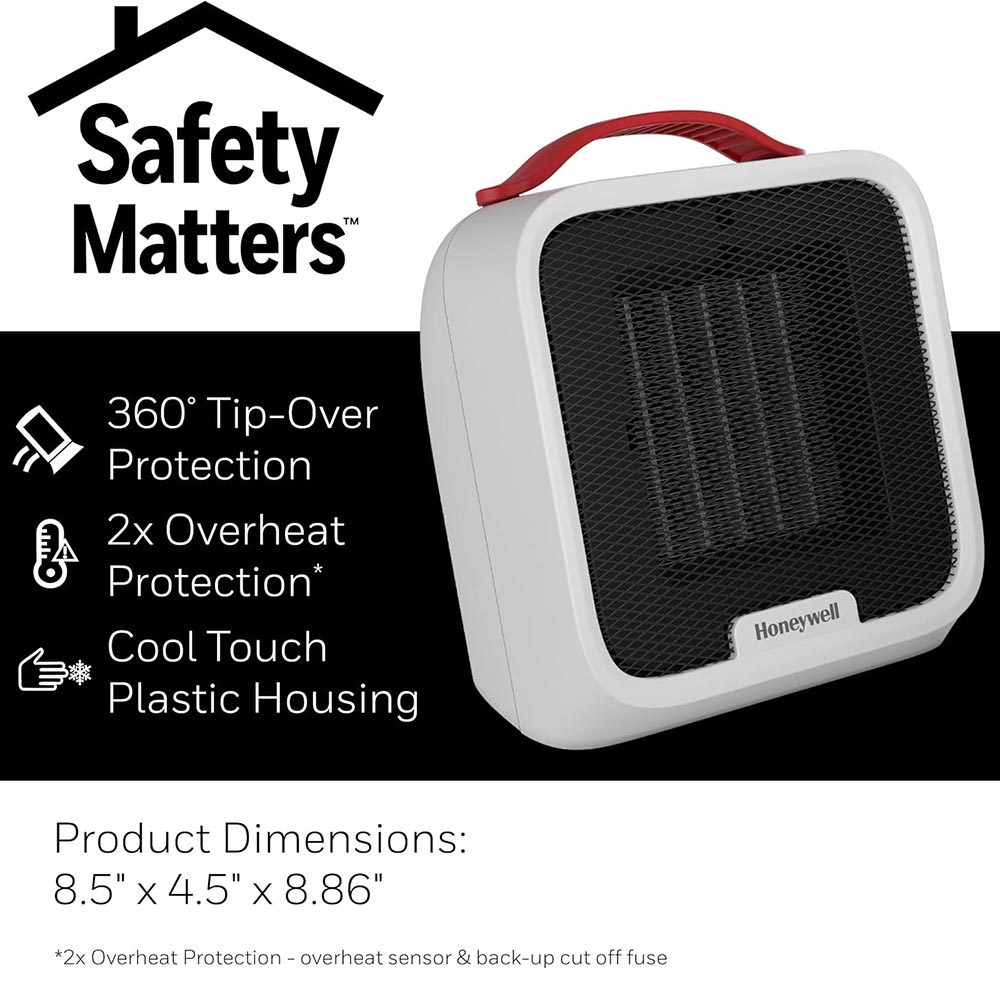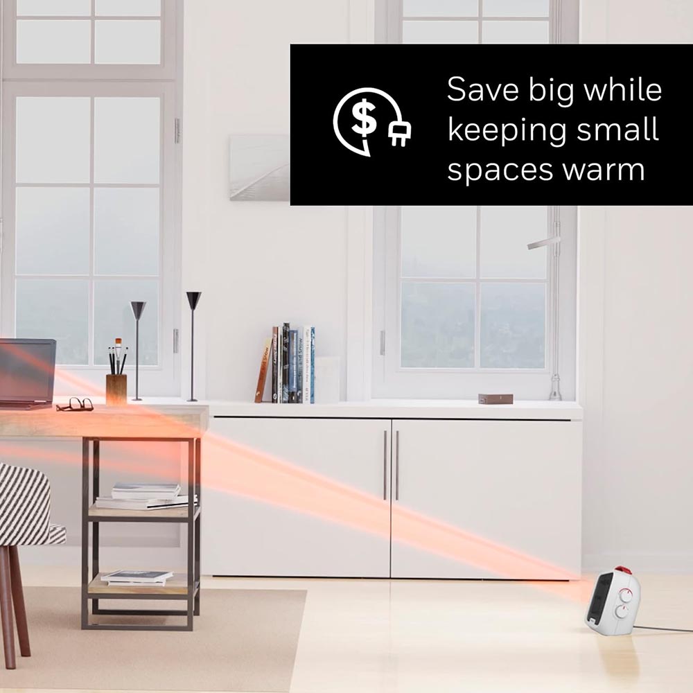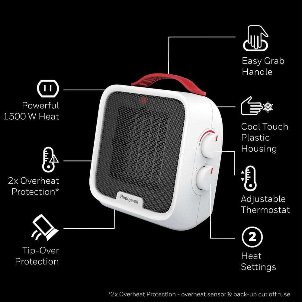 The compact Honeywell UberHeat ceramic space heater delivers powerful, efficient, and targeted warmth for personal spaces like bedrooms and family rooms. This quiet, small space heater is an energy-smart way to supplement your main heating system, with the potential to save you up to $276 annually on heating costs.* Safety is essential. This Honeywell Heater is in line with the "Safety Matters" program offering multiple protections, including a tip-over switch, dual overheat protection, and cool-touch housing. Easy-to-use manual controls and an adjustable thermostat with two comfort settings (high/low) ensure customizable comfort and complete peace of mind.